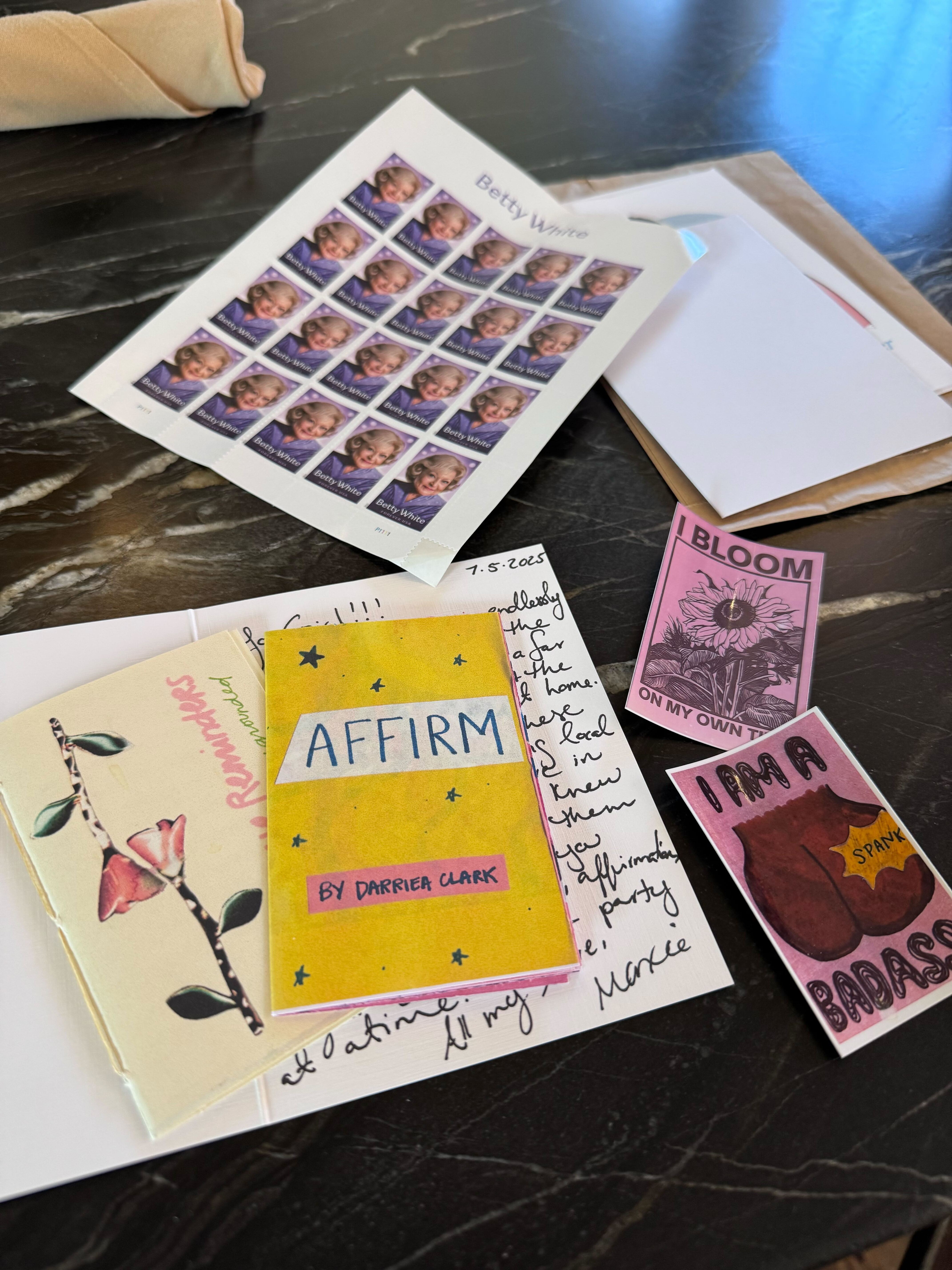 I strolled through Savannah's farmers market, a Saturday morning ritual, and stumbled on the artist, Darriea Clark. I stopped because I saw her beautifully designed zines, ones I knew I needed to buy and mail to a friend. Darriea's art practice is so much of what the world needs, and she is using it to create things for people exactly where they're at: strolling through the park, on a Saturday, thinking of their friend who's going through a hard time, not knowing how to help...and there she was. That's why we've got to keep making things, keeping creating things, regardless of who tells us no or not yet or not this. So that we humans can find each other.